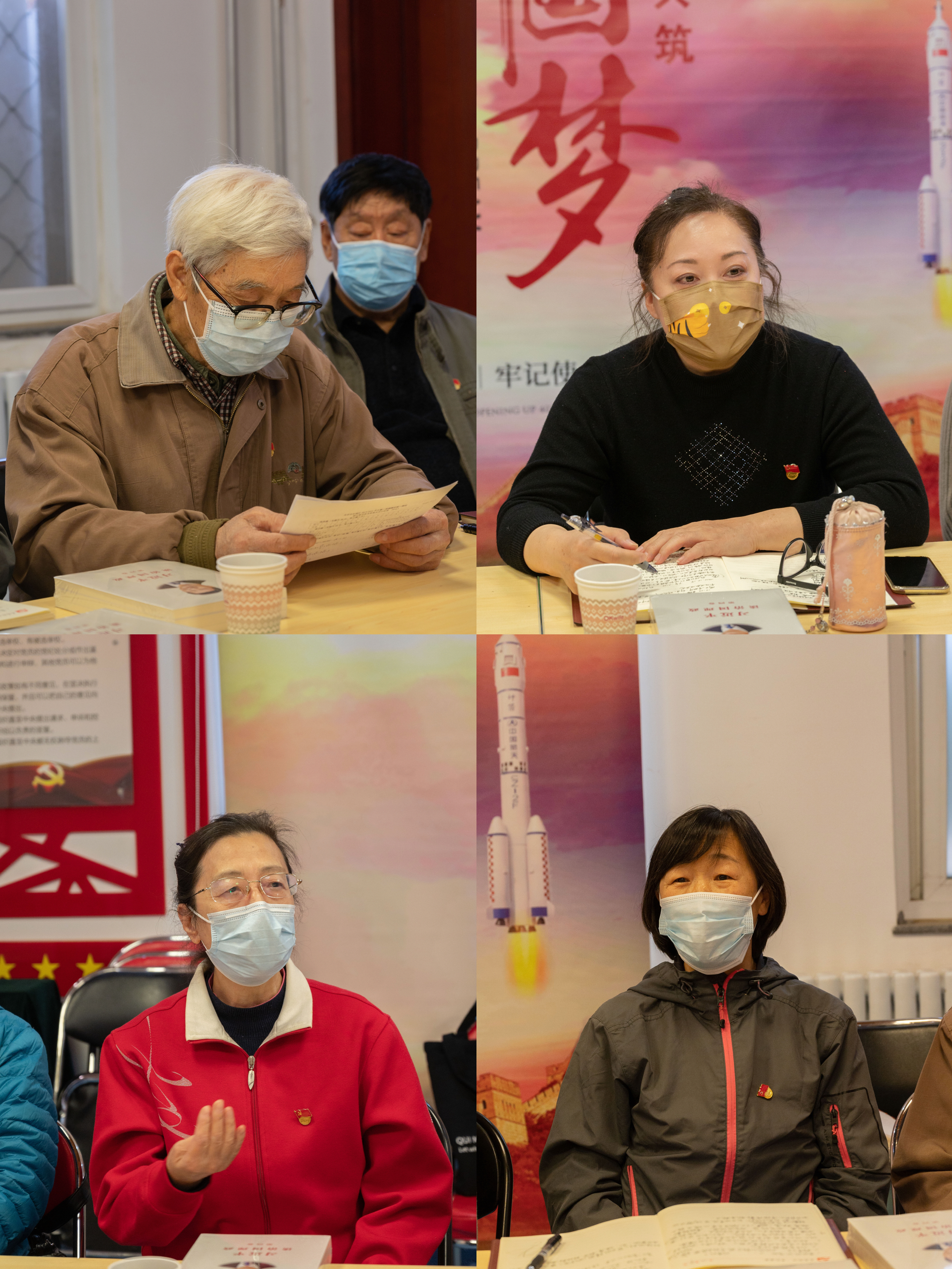 随后,北航社区党委第二支部党员沈洪元同志(图3第一排左)率先分享了他学习二十大报告与《习近平谈治国理政》第四卷的心得体会。与此同时,沈洪元同志作为曾参与“东方红一号”任务的工作者,他为我们讲述了1965年他初到酒泉发射中心时的工作环境与工作趣事。