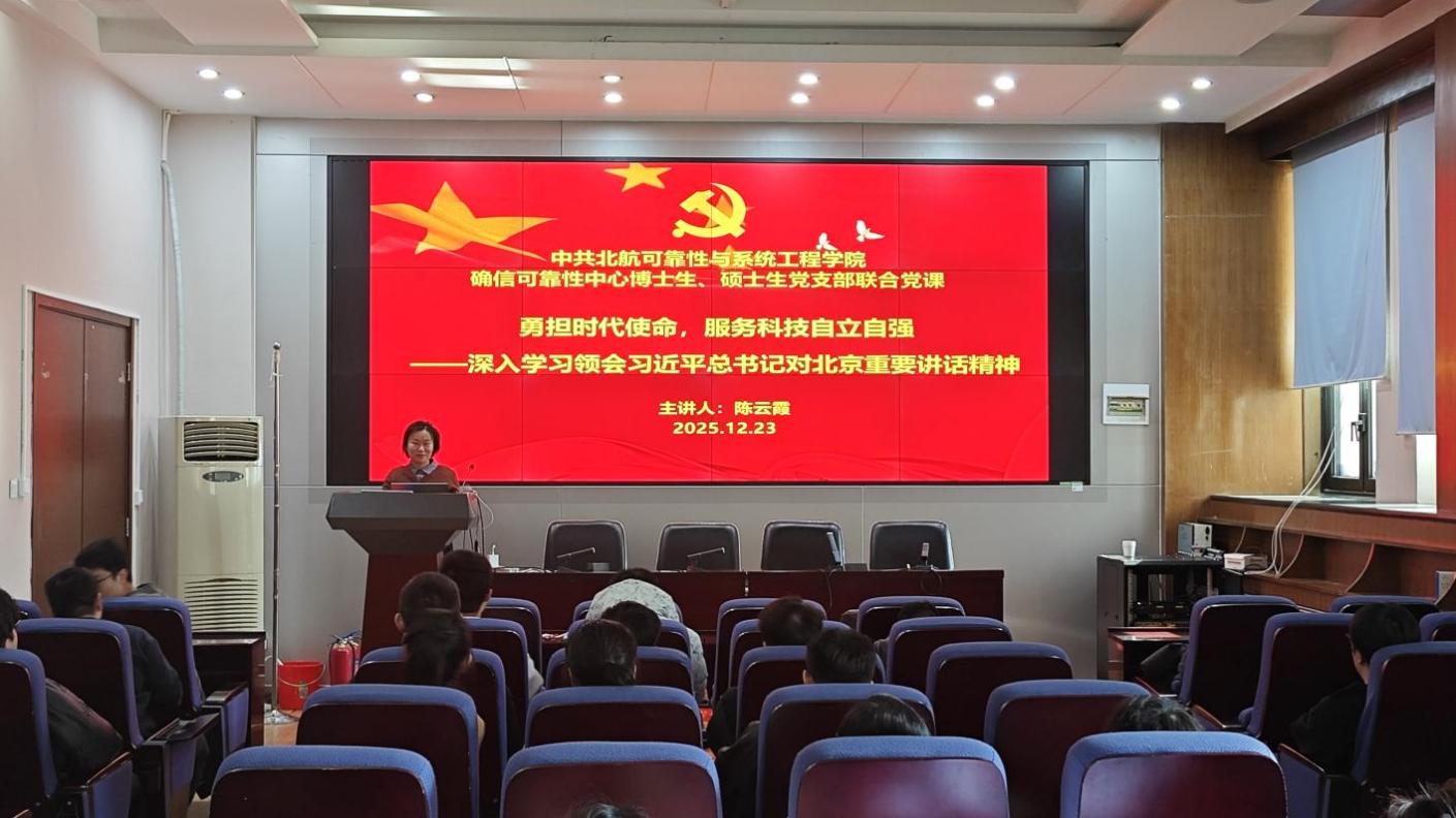 为深入学习领悟党的二十届四中全会精神,强化党员党性修养,激发科研创新动力和科技报国热情,2025年12月23日,确信可靠性中心博士生党支部与硕士生党支部在为民楼320会议室联合开展专题学习。活动邀请学院党委委员、副院长陈云霞老师为中心全体研究生党员讲授“勇担时代使命,服务科技自立自强——深入学习领会习近平总书记对北京重要讲话精神”主题党课。中心博士生党支部书记严鹏程同志主持会议。
