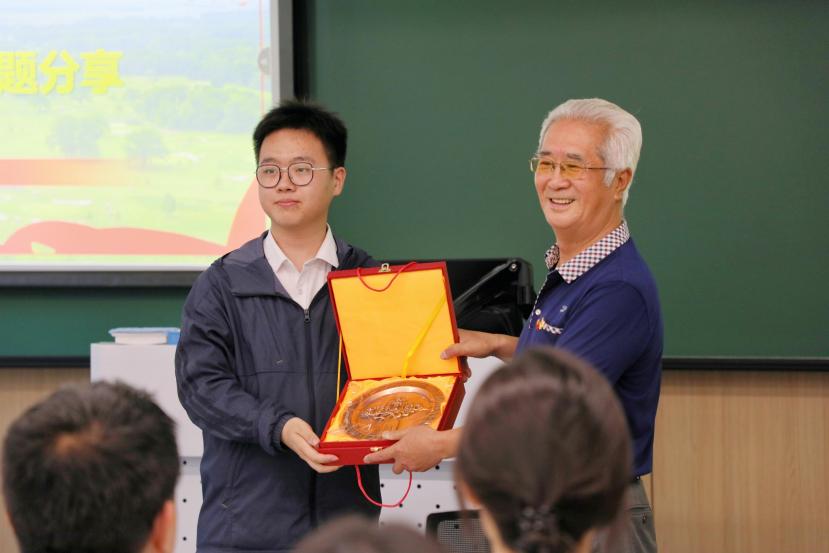 送校训树铜牌意义非凡,当 "党团领航" 的红色基因,遇上 "校训树" 的绿色血脉,这份奖品便有了双重内涵:它既是北航 "空天报国" 精神的传承,更是 "绿水青山就是金山银山" 理念的具化,象征着党建与环保的深度融合。校训树铜牌以枝叶形态为设计元素,以青铜材质铸造盘面 —— 年轮记录时光沉淀,枝叶舒展生态脉络,青铜质地寓意精神永恒,纪念品承载着同学们对安老师的感谢与对党建环保融合的美好期许。安丰杰老师也以中国野生动物保护协会纪念章回赠每位同学,这承载着老一辈环保工作者对青年一代“守护自然、敬畏生命”的殷切期许。