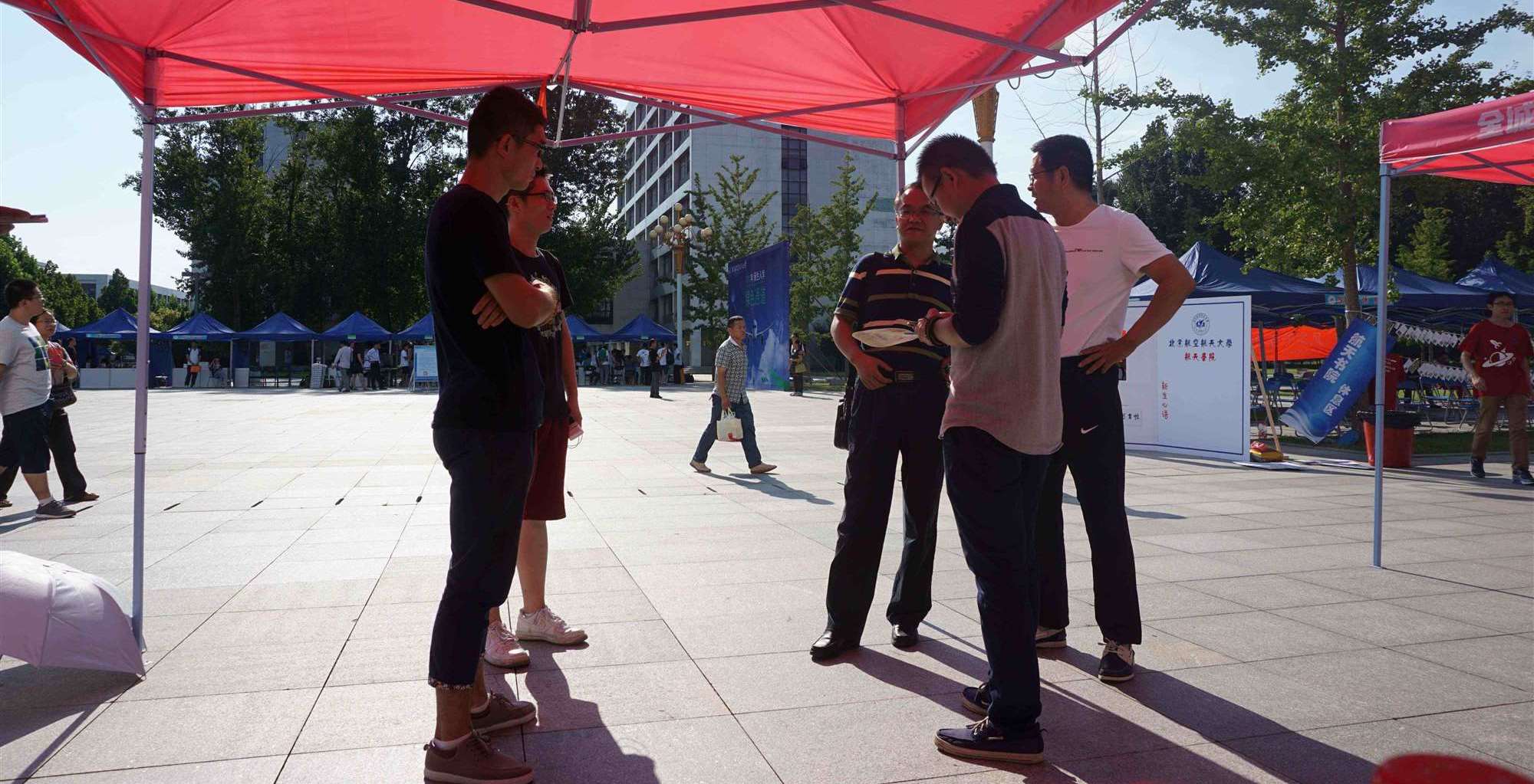 9月6日上午7:00,我院2015年迎新工作人员来到北京航空航天大学沙河校区南门广场,在1号教学楼与2号教学楼之间搭起临时帐篷作为学院新生登记处。志愿者前往南门左侧校车临时停车处,等待乘坐校车的新生及其家长来到校区。我院每一位来报到的新生在志愿者的带领下前往广场右侧的新生登记处进行报到。在查看录取通知书,领取部分校园生活必需品,接待家长和拍照纪念之后,新生及家长在志愿者的带领下前往学生公寓进行布置,沿途志愿者们向新生与家长介绍了校园环境,为新生下一步的校园生活做好准备。