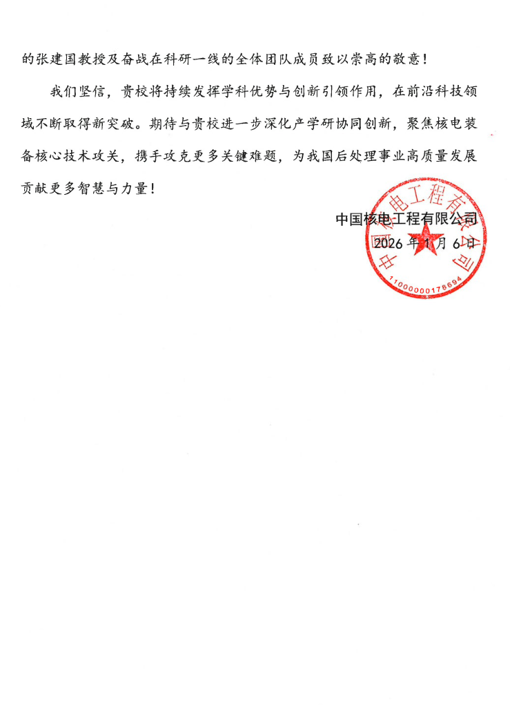 中国核电工程有限公司向我校以及我院张建国教授团队发来感谢信
