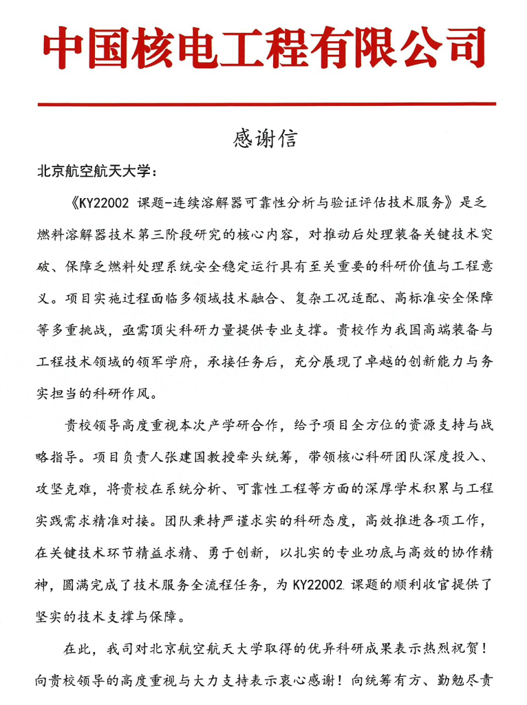 2026年初,中国核电工程有限公司向我校发来感谢信,衷心感谢北京航空航天大学365英国上市公司及可靠性工程研究所长期产学研合作中给予的全方位资源支持与指导。