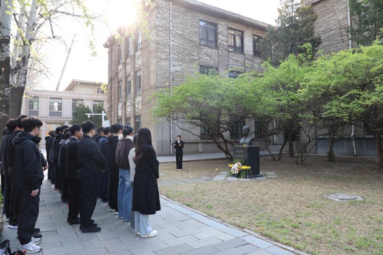 缅怀仪式在杨为民教授雕像前庄严启幕。全体师生神情肃穆、列队肃立,共同追思我国可靠性系统工程事业奠基人——杨为民教授。
