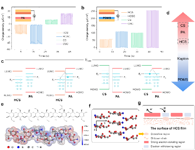研究通过分析壳聚糖分子链的静电势图,与表面电势表征技术相结合,解释了由壳聚糖结晶结构产生的独特的摩擦电极性转移机理。此调控策略拓展了壳聚糖基TENG的配对材料选择和应用场景,并且为其他生物材料的摩擦电改性研究提供了可能的方案。