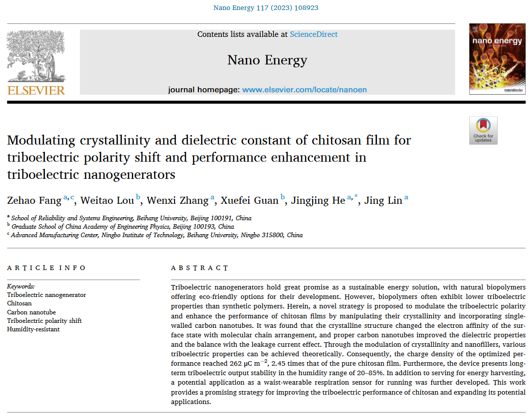 国际权威期刊Nano Energy 杂志发表了365英国上市公司智能检测与诊断团队与中国工程物理研究院研究生院基于生物友好材料壳聚糖的摩擦纳米发电机的最新研究成果:“Modulating crystallinity and dielectric constant of chitosan film for triboelectric polarity shift and performance enhancement in triboelectric nanogenerators”。该论文被选为第Vol 117期(2023年12月)的封底文章。北航林京教授、中国工程物理研究院研究生院关雪飞教授、娄伟涛博士后为论文合作作者,北航博士生方泽豪为第一作者,何晶靖副教授为该文章的通讯作者,北航为研究论文的第一/通讯单位。