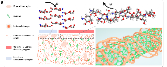摩擦电纳米发电机(TENG)作为一种新兴技术,在能量收集方面具有广阔的应用前景。此项研究提出了一种基于壳聚糖的结晶度调控和介电性能增强的策略。封面的主体,以螃蟹的形式突出所使用的生物材料壳聚糖。螃蟹体内表达了本文摩擦电改性的两种机理:材料内壳聚糖聚合物链形成了结晶结构(蓝色小方块),通过调控结晶程度,可实现摩擦电极性的转变。另一方面,聚合物链缠绕的碳纳米管,在界面处会产生深陷态,从而诱导更多摩擦电荷,提升摩擦电性能。