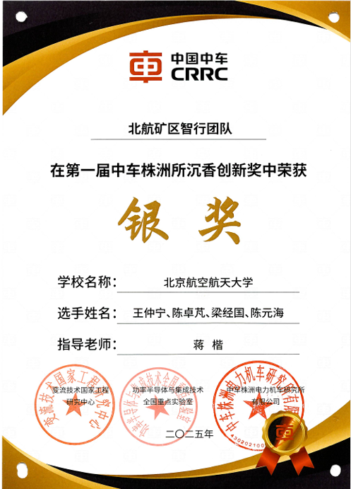2025年4月,中车株洲电力机车研究所有限公司举办了第五届科技节及第一届沉香创新奖决赛。北京航空航天大学智能检测与诊断中心组建的矿区智行团队在全国顶尖高校的激烈竞争中,凭借“矿区智行系统创新项目”荣获沉香创新奖银奖。